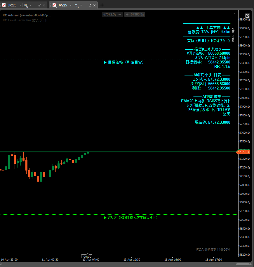 AI 分析部分(Claude API呼び出し)はリアルタイムのみの動作です。 S/Rゾーンの表示・KOバリア候補の算出はバックテスト環境でも確認できます。