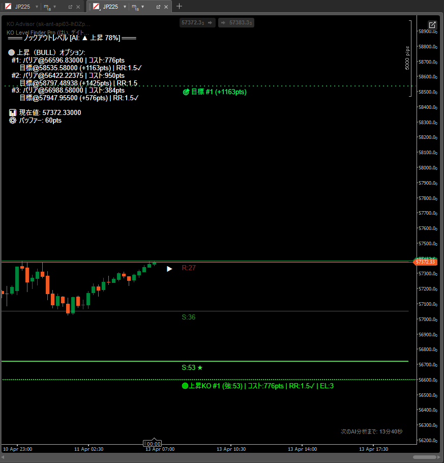 S/Rゾーンを自動検出してKOバリア候補を算出。Claude AI が方向・エントリー価格・TP を即座に提示するcTrader専用インジケーター